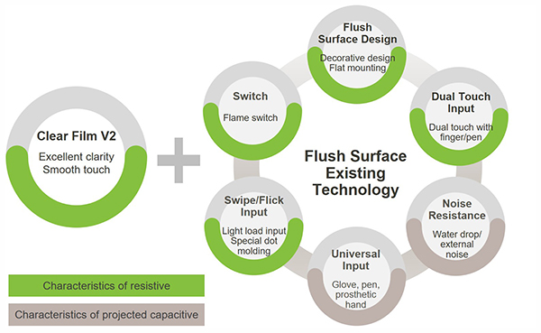 Combination of flush surface touch panel and clear film v2 provides a stylish appearance and smooth operability comparable to projected capacitive touch panels.